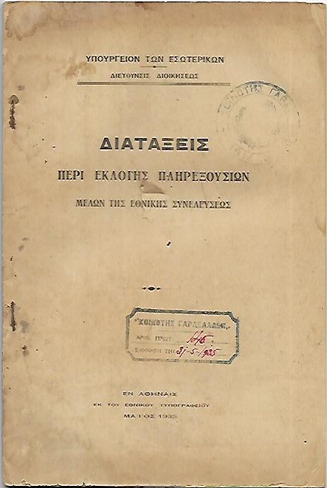 Διατάξεις περί εκλογής πληρεξουσίων μελών της Εθνικής Συνελεύσεως ποσότητα